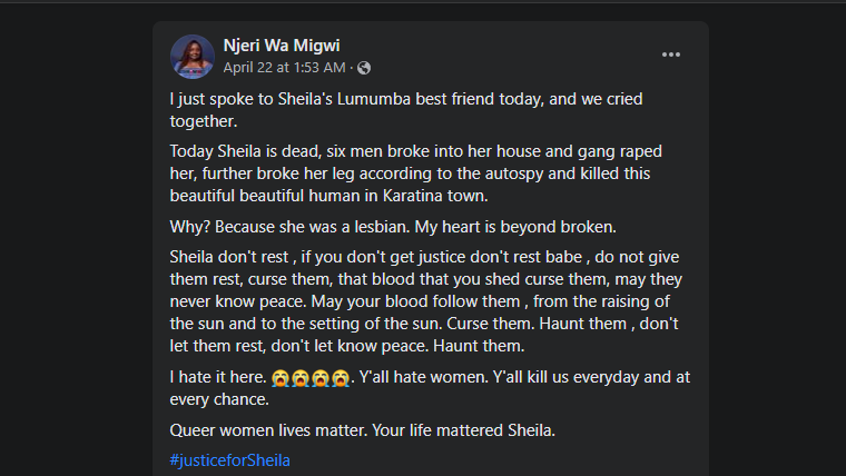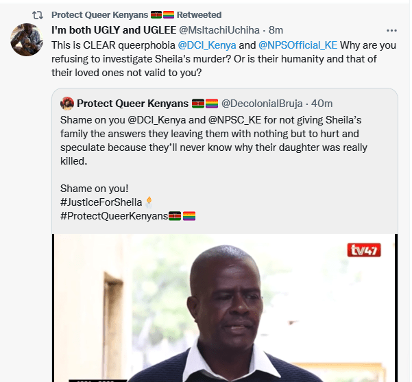 In a series of tweets, Kenyan Twitter user and Queer rights activist, @DecolonialBruja, echoed our fears of lack of protection and sheer vulnerability as Queer Kenyans saying, “Sheila and I are both 25 and lesbians. I can’t rest because I am one statistic away from being this,” while also taking the Kenyan police force to task on not providing Lumumba’s family with answers concerning their gruesome murder. Lumumba’s mother divulged the horrifying state of their body which had stab wounds in several places including in both eyes, while their head showed signs of blunt force trauma leading to her death through exsanguination.